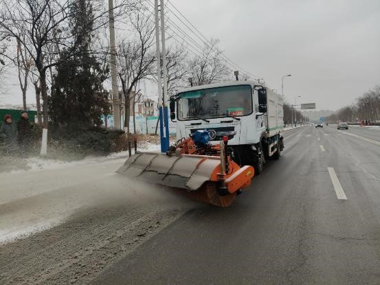 公司迅速集結(jié)23名工作人員,調(diào)配除雪車、融雪劑灑布車各1臺,前往渤海十三路(黃河一路至黃河二路段)開展開除雪作業(yè)。